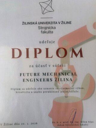 Naši študenti sa dňa 20. 3. 2026 zúčastnili súťaže FUTURE MECHANICAL ENGINEERS ŽILINA na Strojníckej fakulte UNIZA.